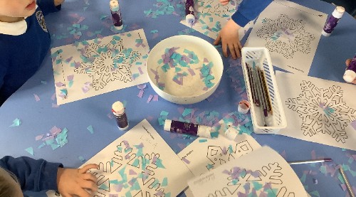 The children have also collaged snowflakes, which currently